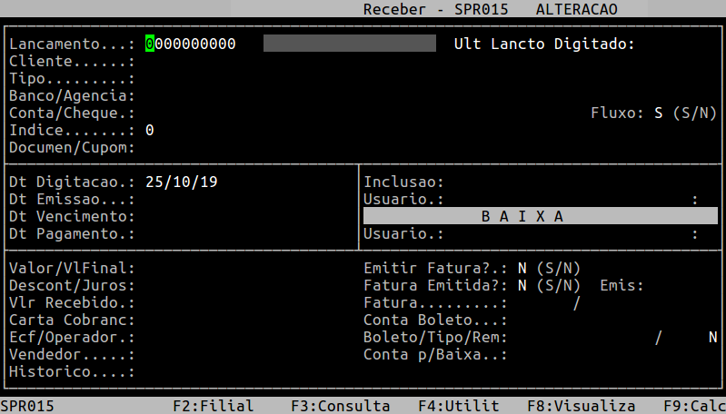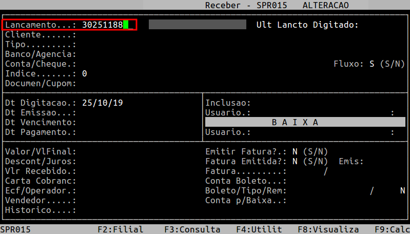 Ao acessar a rotina, no campo Lacamento informe o número do lançamento que deseja alterar e pressione a tecla Page Down até encontrar o lançamento desejado, conforme os exemplos abaixo.