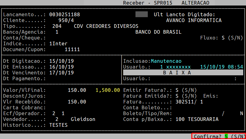 Assim que preencher os campos acima, pressione a tecla Enter ou S para confirmar. Abaixo segue um exemplo das alterações realizadas na rotina, ressaltando que os dados são meramente ilustrativos.