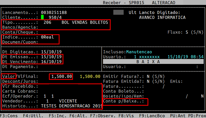 OBSERVAÇÃO: Os demais campos que não estão no quadro acima não permitem alteração, tais como: Lançamento, Cliente, Dt Digitação e Conta Boleto, pois por se tratar de segurança da originalidade do lançamento não permite a alteração por serem “chaves”. |