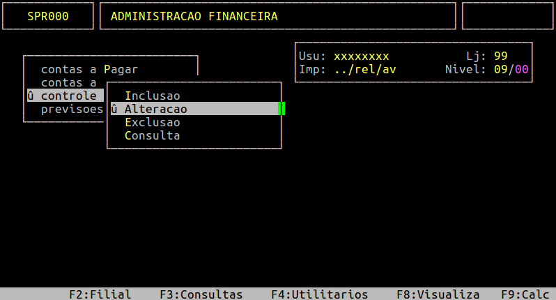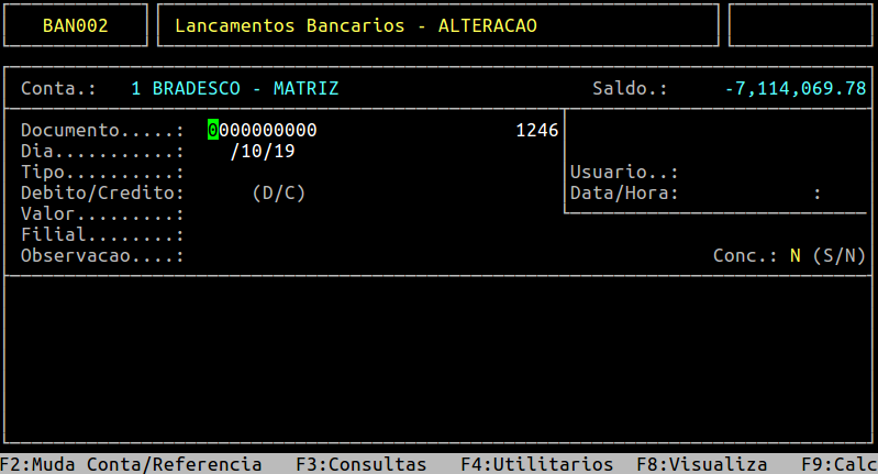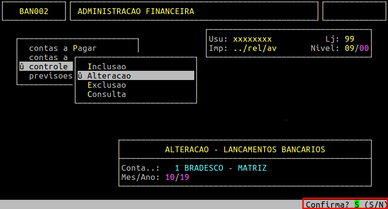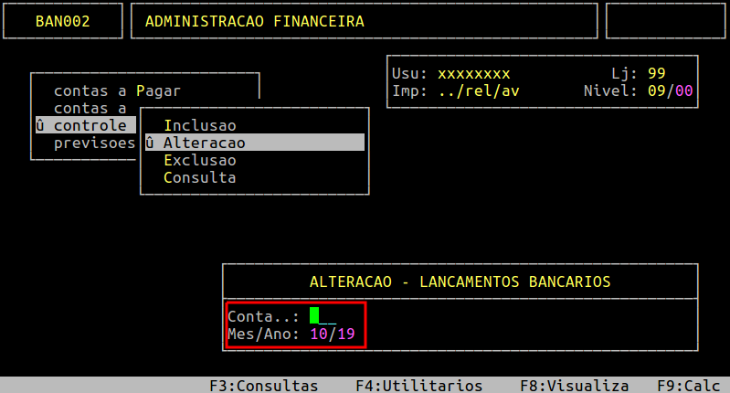 Localização: | Administracao Financeira / Controle Bancario / Alteracao |