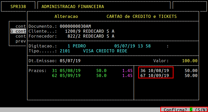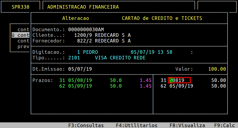 Administracao Financeira / Contas a Receber / Tickets - Cartao / Alteracao |
