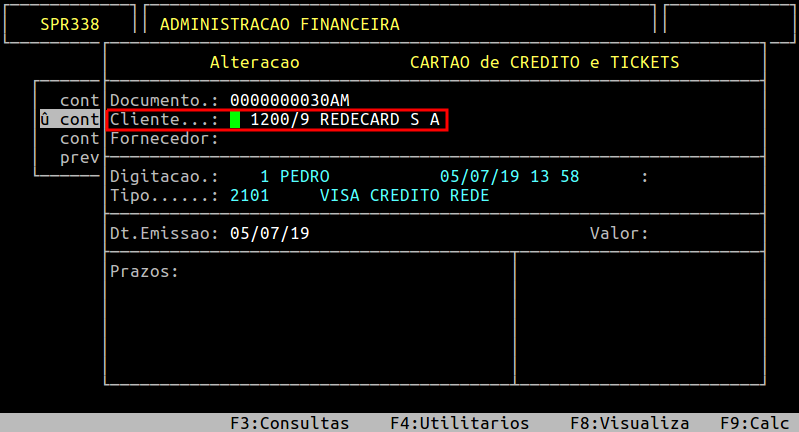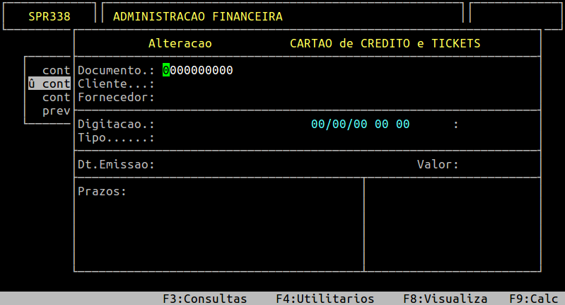 Ao acessar a rotina Alteração CARTAO de CREDITO e TICKETS, no campo Documento, informe o número do lançamento (primeiro espaço deverá conter somente números) e pressione a tecla Enter.