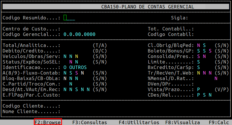 Ao acessar a rotina, no campo Codigo Resumido informe o código da conta ou pressione a tecla F2 para verificar as opções do sistema.