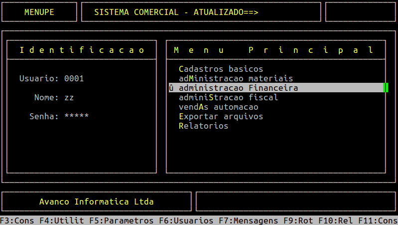 Assim que preencher os campos acima, pressione a tecla Enter ou S para confirmar. Abaixo segue um exemplo da tela preenchida, ressaltando que os dados são meramente ilustrativos.