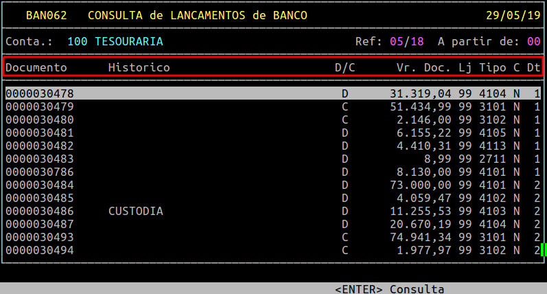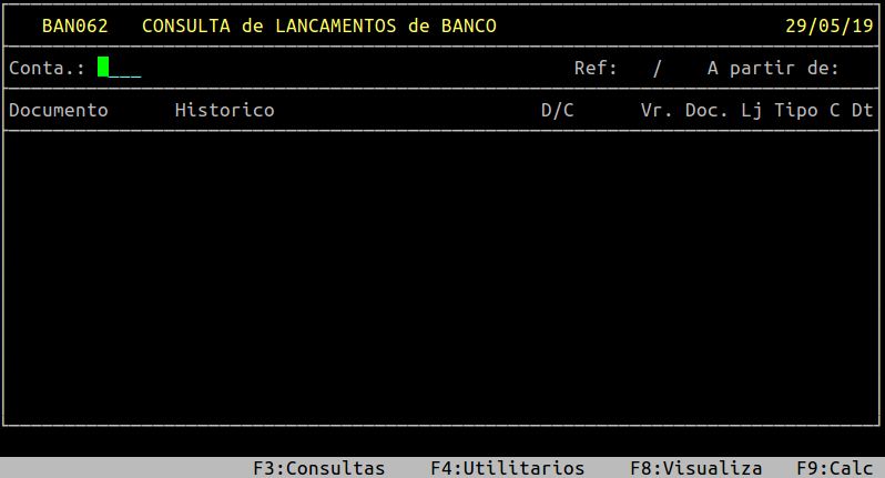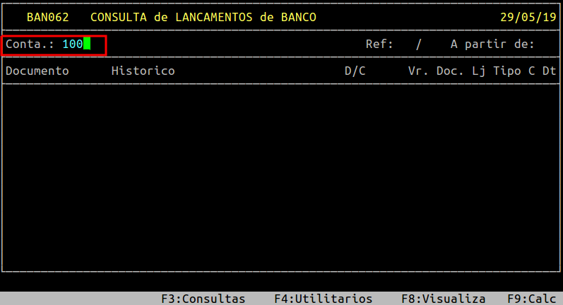 Ao acessar a rotina Consulta de Lançamentos de Banco, informe no campo Conta a conta no qual deseja consultar os lançamentos bancários, e pressione a tecla Enter para prosseguir para o próximo campo.