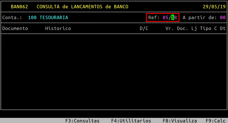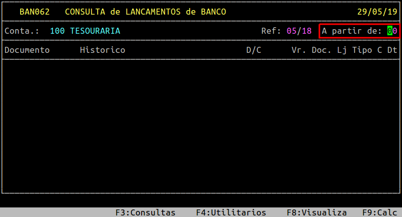 No campo A partir de, informe a partir de qual dia será realizada a consulta, ou pressione a tecla Enter para deixar 00 para considerar todos os dias do mês informado.