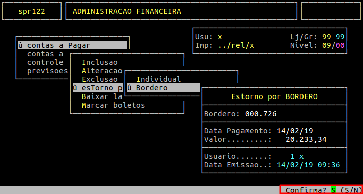 Em sequência, informe a letra S para confirmar o estorno, conforme o exemplo abaixo.