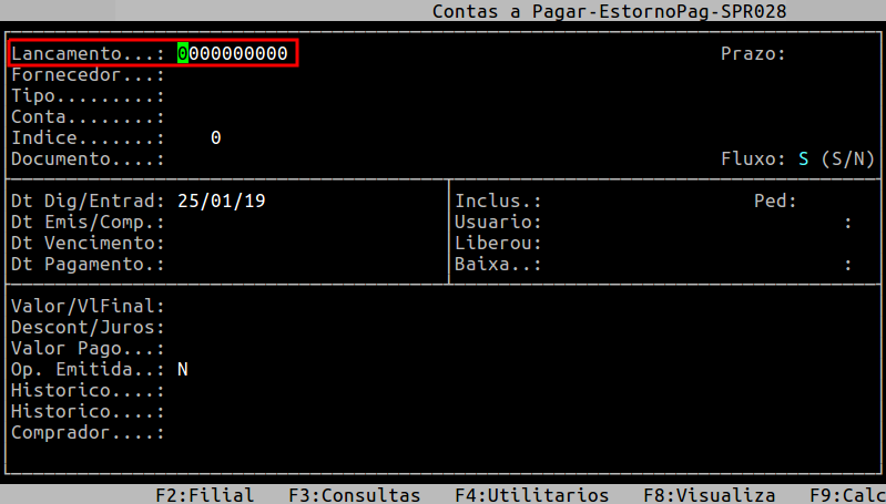 Ao acessar a rotina, no campo Lacamento informe o número do lançamento e pressione a tecla Page Down até encontrar o lançamento desejado.