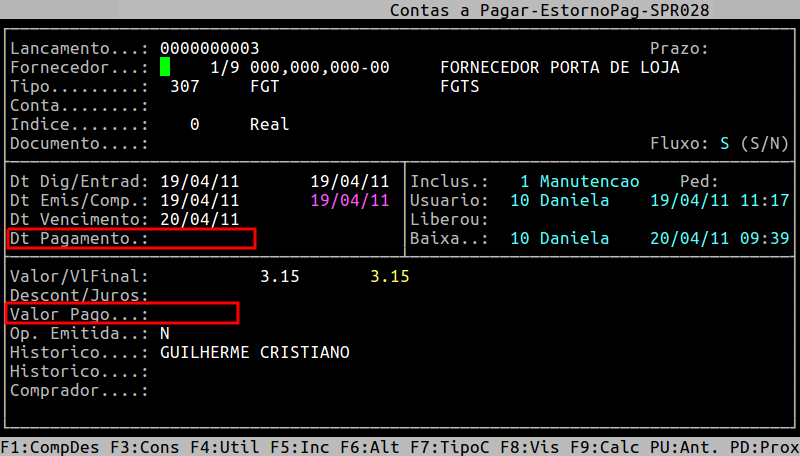 Após o estorno do lançamento, é possível verificar, na mesma rotina ou na rotina de consultar lançamento (para mais informações, consulte o documento " Dúvida | Como Consultar Lançamento Contas Pagar Integral Varejo? ") que os campos Dt Pagamento e Valor Pago não estão preenchidos, conforme o exemplo abaixo.