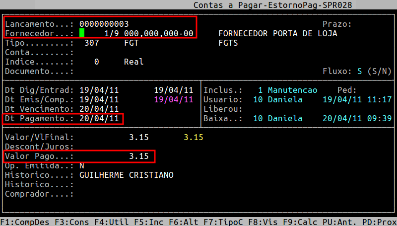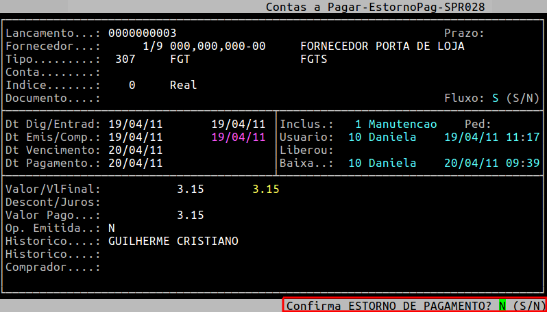 Para estornar o valor que foi pago, pressione a tecla Enter. Observe que o sistema exibirá a mensagem Confirma ESTORNO DE PAGAMENTO?, no qual deverá informar S para estornar o pagamento ou N para não estornar.