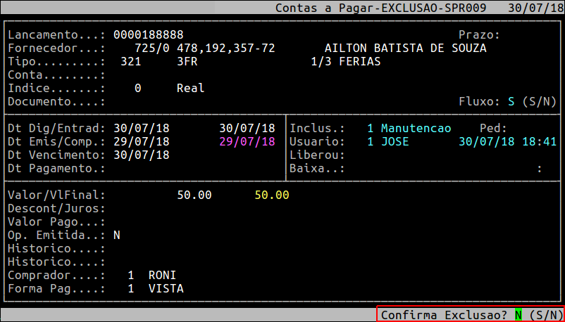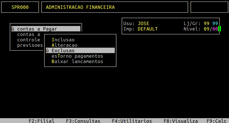 Localização: | Administracao Financeira / Contas a Pagar / Exclusao |