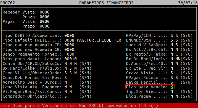 Após a alteração do parâmetro de Dias de Vencim, o sistema permitirá a exclusão do lançamento digitado no mesmo dia da data de vencimento.