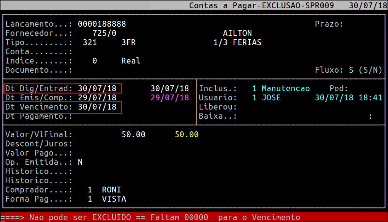 Observe que a data da digitação, no exemplo acima, foi realizado no dia 30/07/18 e o vencimento também está no dia 30/07/18. Ao tentar excluir o lançamento no contas a pagar, o sistema retorna que o mesmo não pode ser excluído, pois faltam zero dias para o vencimento. Essa mensagem, entretanto, ocorre conforme a configuração do parâmetro de permissão de exclusão a partir de x dias para vencimento, no qual será melhor demonstrado no tópico a seguir.