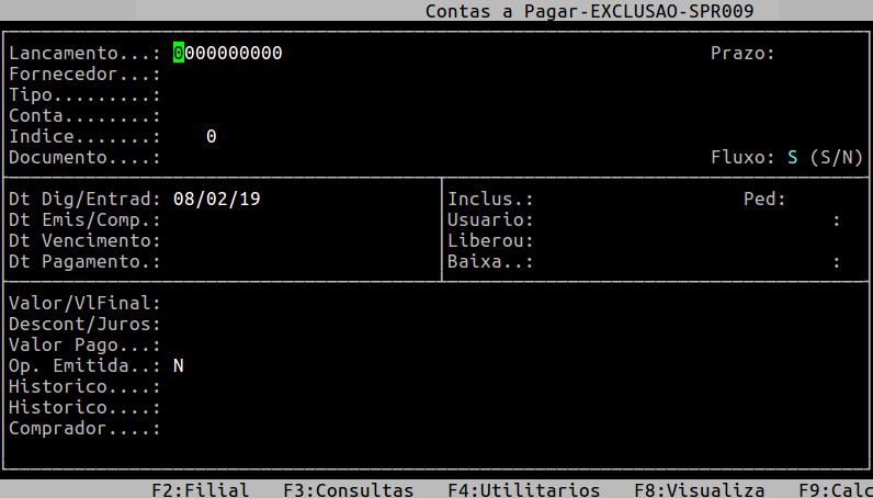 Ao acessar a rotina, informe no campo Lancamento o número do lançamento desejado. Em seguida, pressione a tecla Page Down até carregar a nota correta (confere os dados, pois pode ter lançamentos com a mesma numeração). Após carregar os dados da nota, pressione a tecla Enter. O sistema exibirá a mensagem Confirma Exclusao, no qual se desejar excluir informe a letra S, ou N para não excluir.