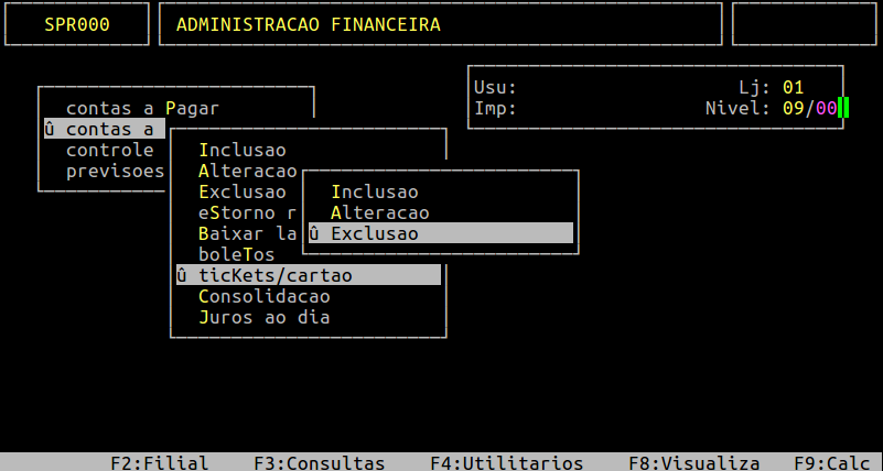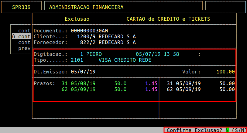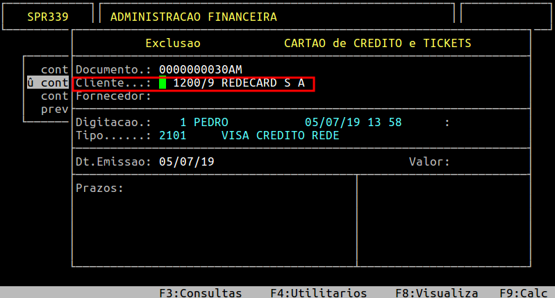 Rotina: | Exclusão CARTAO de CREDITO e TICKETS |