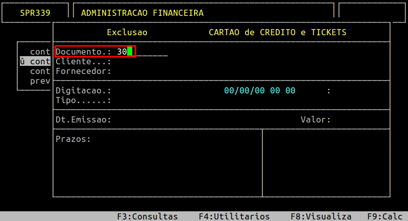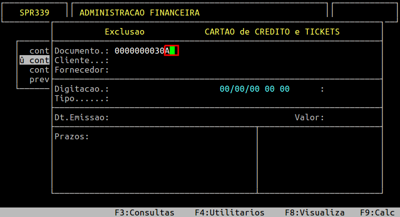 Ao acessar a rotina Exclusão CARTAO de CREDITO e TICKETS, no campo Documento, informe o número do lançamento (primeiro espaço deverá conter somente números) e pressione a tecla Enter.