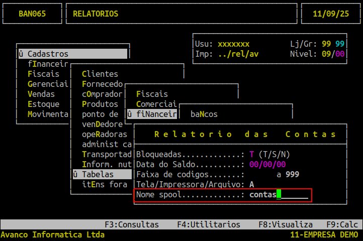 Para visualizar o relatório, pressione a tecla F8, informe no campo Arquivo:../rel/ o nome dado no campo Nome spool e pressione a tecla Enter para carregar o relatório gerado.