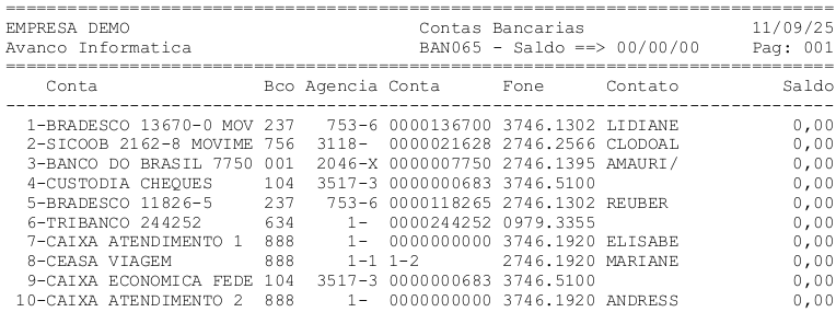 Para gerar o relatório de contas bancárias, acesse a localização citada acima.