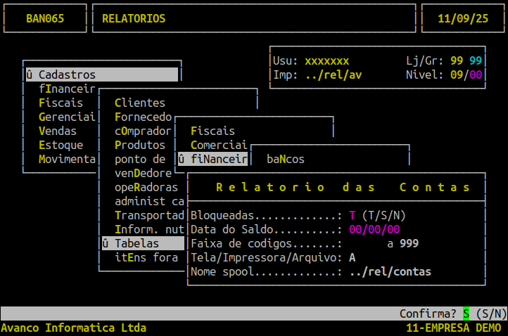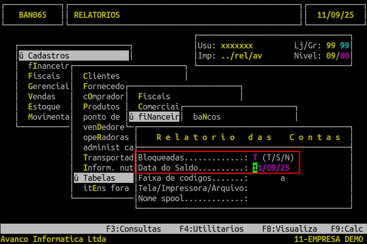 Ao acessar a rotina o sistema traz como padrão T (todos) no campo Bloqueadas para visualizar no relatório as contas bloqueadas e as não bloqueadas. Entretanto, se desejar alterar para visualizar somente as contas bloqueadas (S) ou para não aparecer no relatório essas contas (N), será necessário voltar com a seta do teclado e informar a letra correspondente.