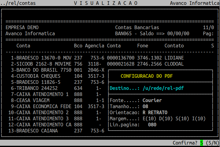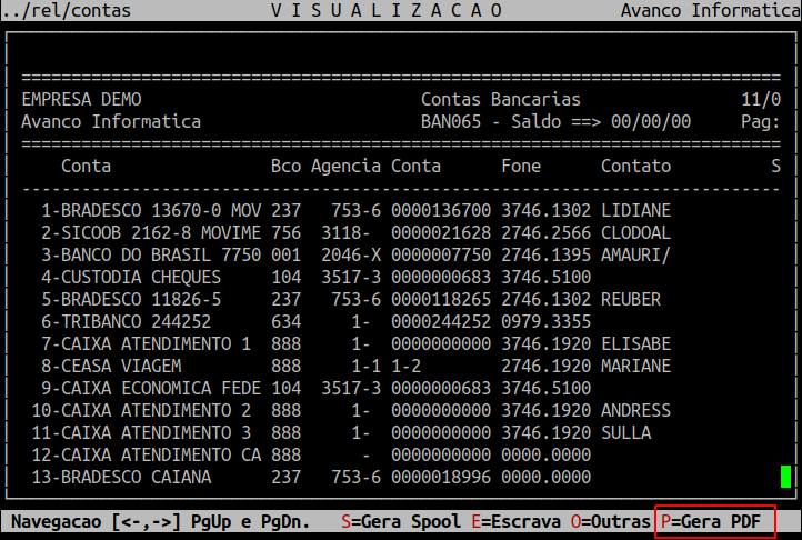 Ao aparecer o relatório na tela, se desejar visualizá-lo em pdf em seguida, deverá pressionar a tecla P para gerar na pasta /u/rede/rel-pdf.