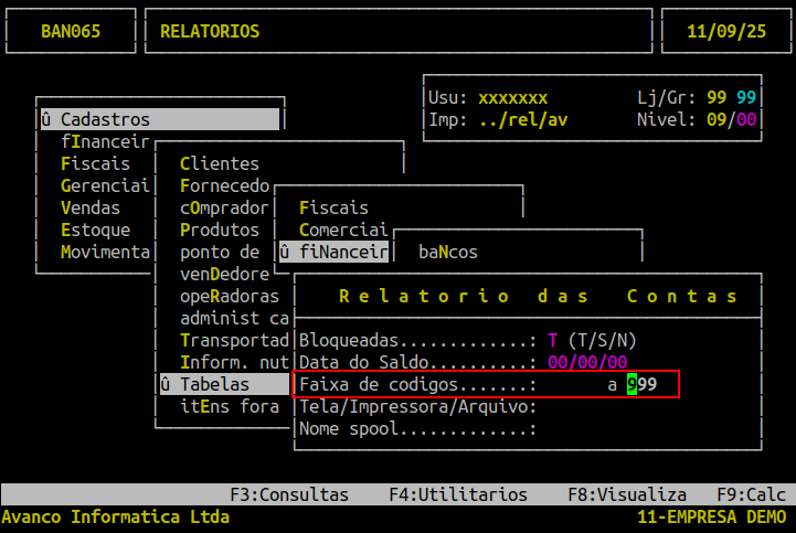 No campo Faixa de codigos, informe uma faixa de contas que deseja visualizar ou pressione a tecla Enter para considerar todas (o sistema preencherá com 001 a 999).