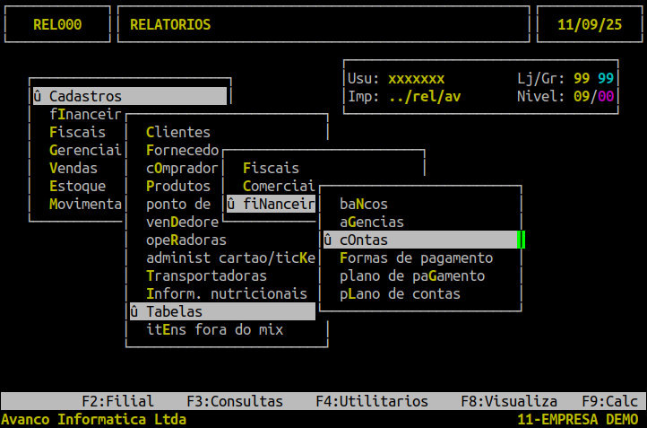 Localização: | Relatorios / Cadastros / Tabelas / Financeiras / Contas |
