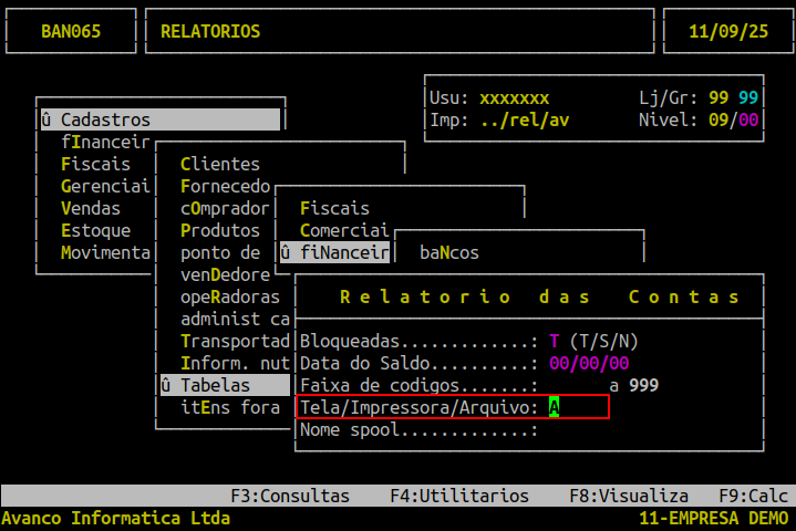 No campo Tela/Impressora/Arquivo, informe a letra T para visualizar o relatório na tela, ou I para imprimir, ou A para gerar um arquivo.