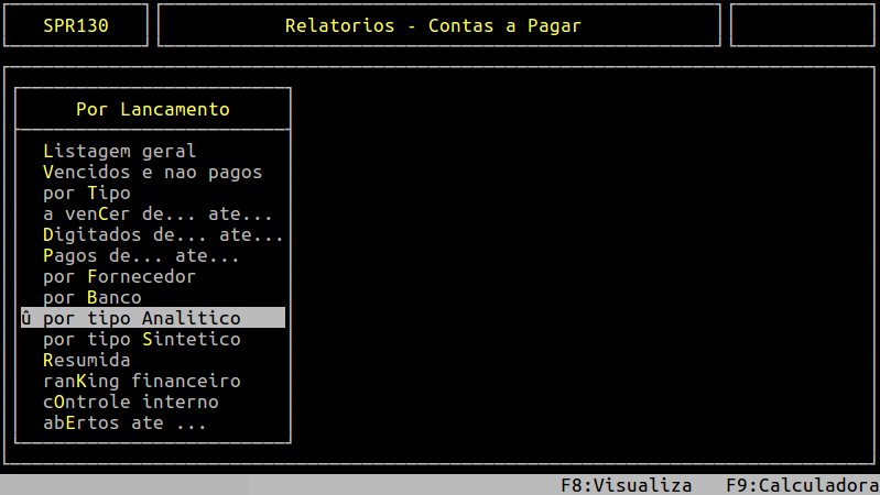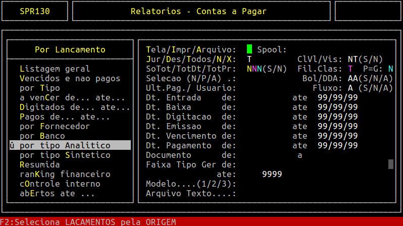 Localização: | Relatorios / Financeiros / Contas a Pagar / por Lancamentos / por Tipo Analitico |