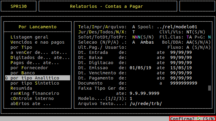 Assim que preencher os campos acima, pressione a tecla Enter ou S para confirmar e gerar o relatório, conforme o exemplo abaixo.