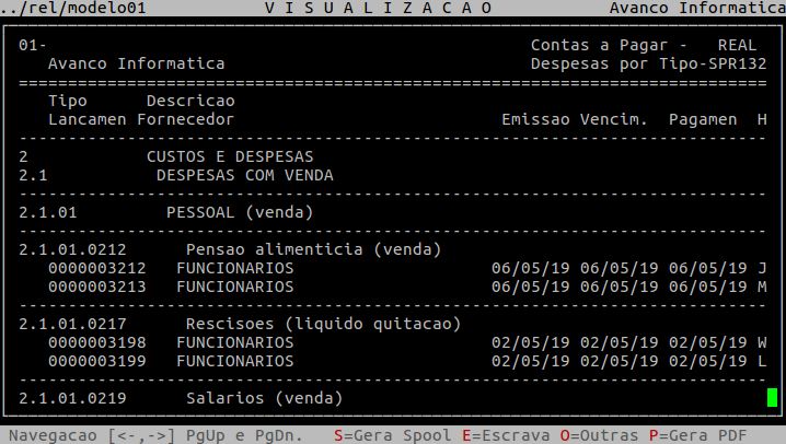Em seguida, para visualizar o relatório, pressione a tecla F8, informe o nome dado ao Spool e pressione a tecla Enter para visualizá-lo na tela, conforme o exemplo abaixo. Se desejar visualizar em pdf, em seguida, deverá pressionar a tecla P e a Enter até confirmar para gerar na pasta /u/rede/rel-pdf.
