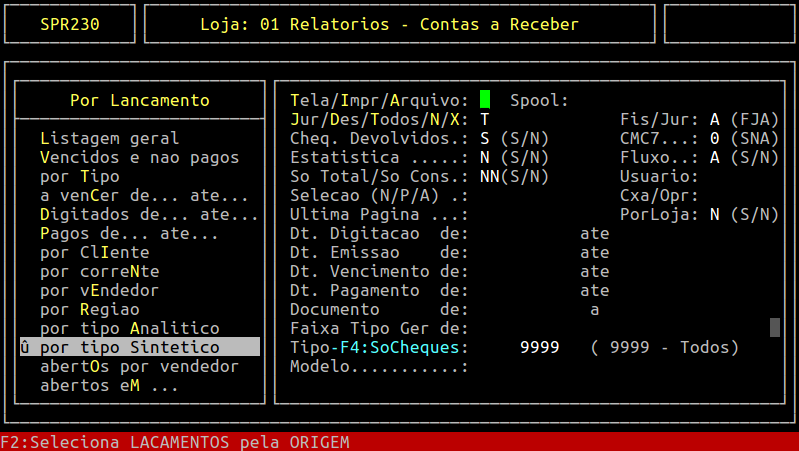Localização: | Relatorios / Financeiros / Contas a Receber / por Lancamentos / por Tipo Sintetico |