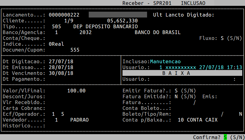 Boleto/Tipo/Rem: | Informe o número do boleto emitido / informe o tipo gerencial do plano de contas / informe S se a remessa foi emitida ou N para não. |