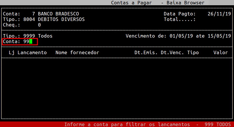 No campo Conta, informe a conta dos lançamentos gravado no financeiro, ou 999 para considerar todos.