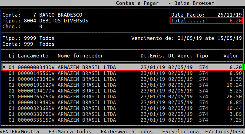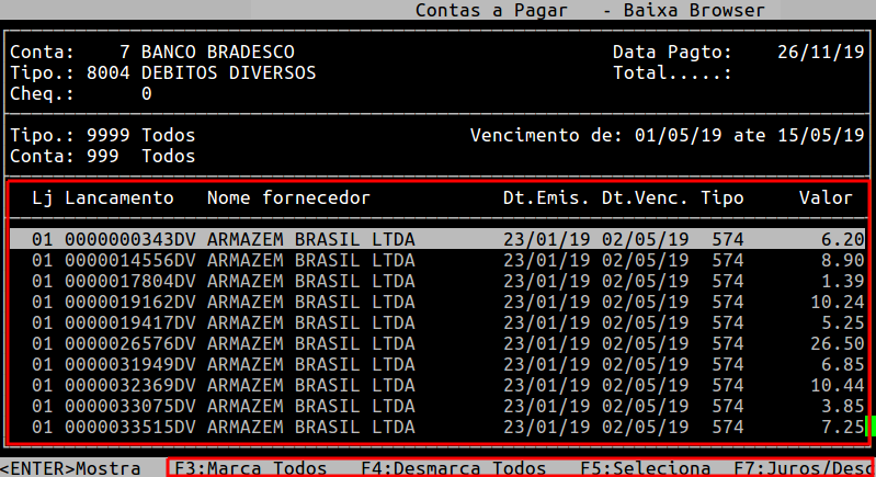 As opções situadas no rodapé do sistema, são as ações possíveis para os lançamentos, sendo elas: marcar todos os lançamentos que aparecem na tela (tecla F3), desmarcar todos os lançamentos selecionados (tecla F4), selecionar individualmente os lançamentos (tecla F5), aplicar juros ou desconto (tecla F7).