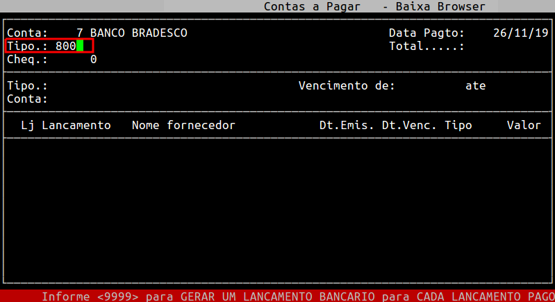 No campo Tipo, informe o tipo gerencial do plano de contas para gravar um único lançamento no bancário ou 9999 para gravar as baixas separadamente.