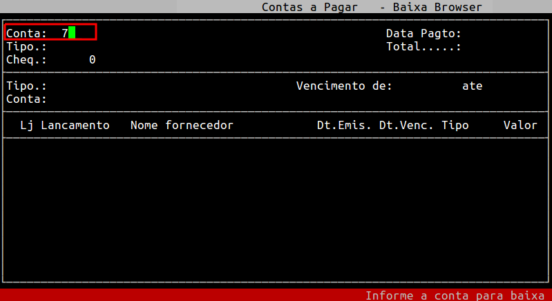 Ao acessar a rotina, no campo Conta, informe o código da conta, no qual os lançamentos serão baixados.