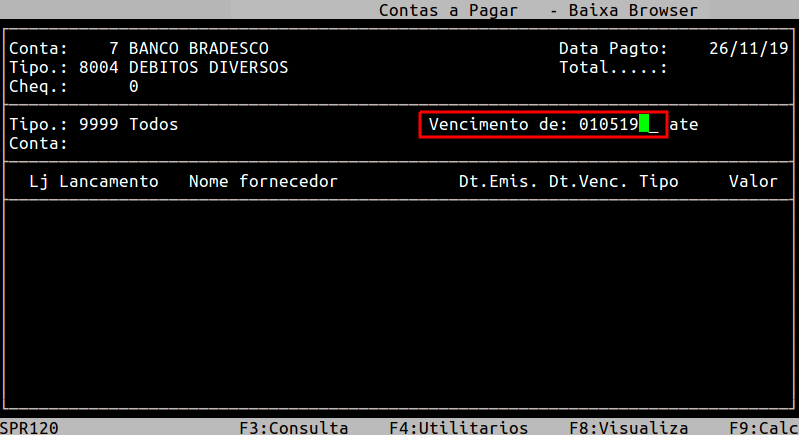No campo Vencimento de, informe a data inicial de vencimento dos lançamentos e, pressione a tecla Enter para prosseguir.