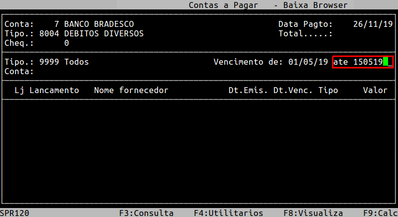 No campo ate, informe a data final de vencimento dos lançamentos e, pressione a tecla Enter para prosseguir.