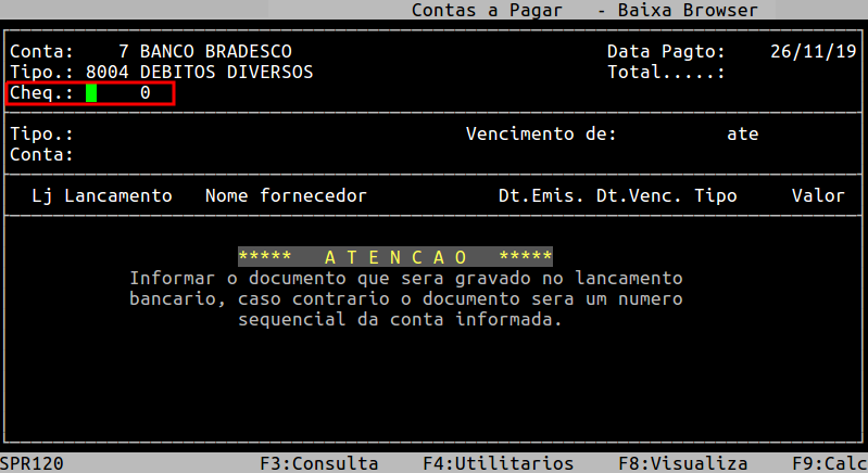 No campo Cheq, informe o número do cheque para gravação no bancário, caso o pagamento for em cheque, ou pressione a tecla Enter para prosseguir.