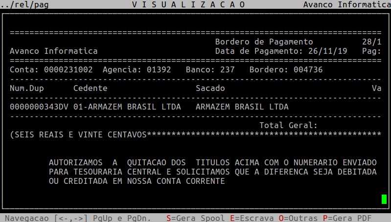 Em seguida, para visualizar o relatório, pressione a tecla F8, informe o nome dado ao Spool e pressione a tecla Enter para visualizá-lo na tela, conforme o exemplo abaixo. Se desejar visualizar em pdf, em seguida, deverá pressionar a tecla P e a Enter até confirmar para gerar na pasta /u/rede/rel-pdf.