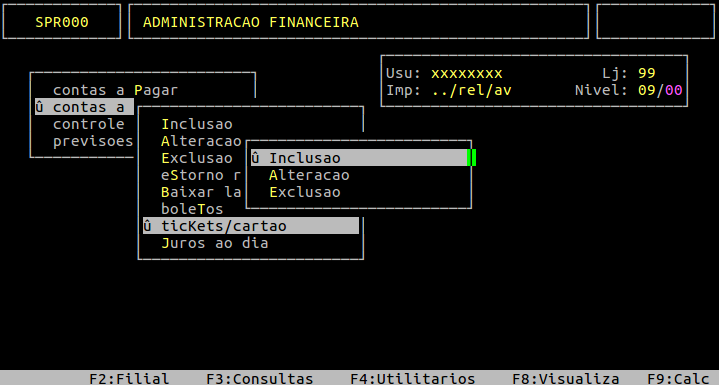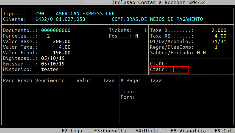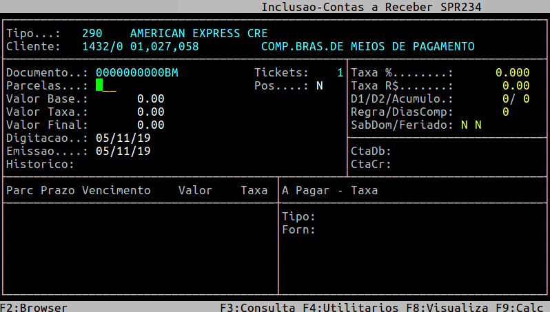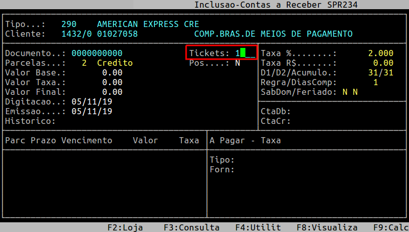 Localização: | Administracao Financeira / Contas a Receber / Tickets - cartao / Inclusao |