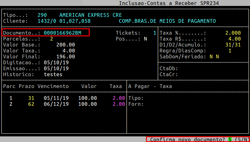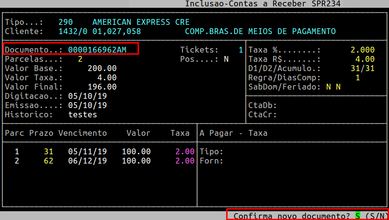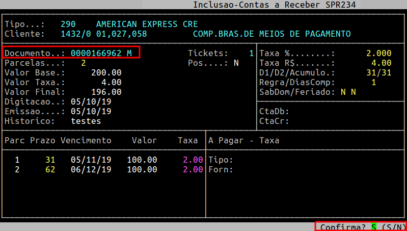 Em sequência, o sistema solicita a confirmação da parcela, no qual deverá pressionar a tecla Enter ou S para confirmar.
