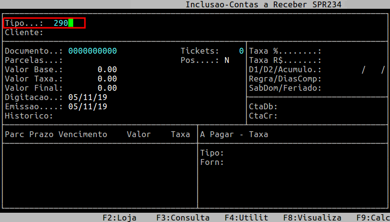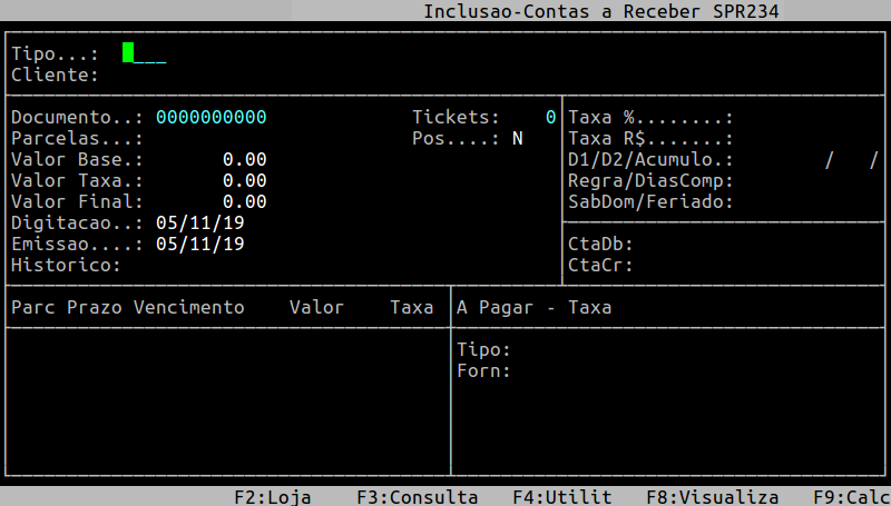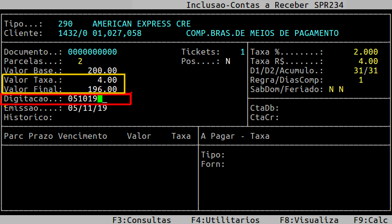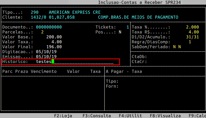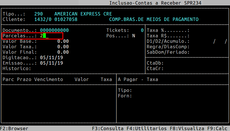 Quando o sistema retornar o cursor para o campo Parcelas, pressione a tecla Esc para sair do sistema.