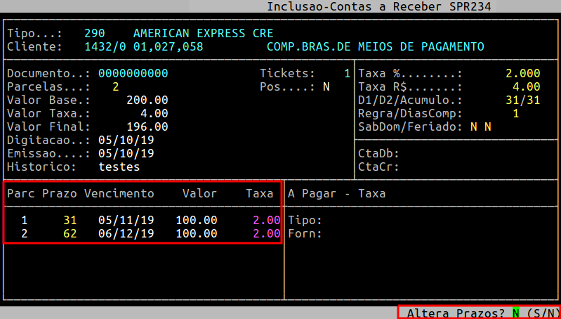 Após ter completado os campos, o sistema pergunta se deseja Alterar Prazos?, no qual deverá informar S (sim) para alterar os prazos de vencimentos ou N para não alterar. No exemplo deste documento foi informado N.