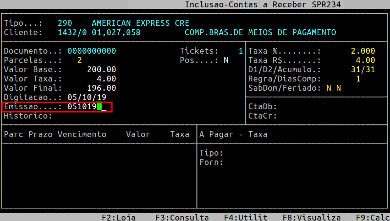 No campo Emissao, informe a data em que foi o cartão foi utilizado no estabelecimento e, pressione a tecla Enter para prosseguir.