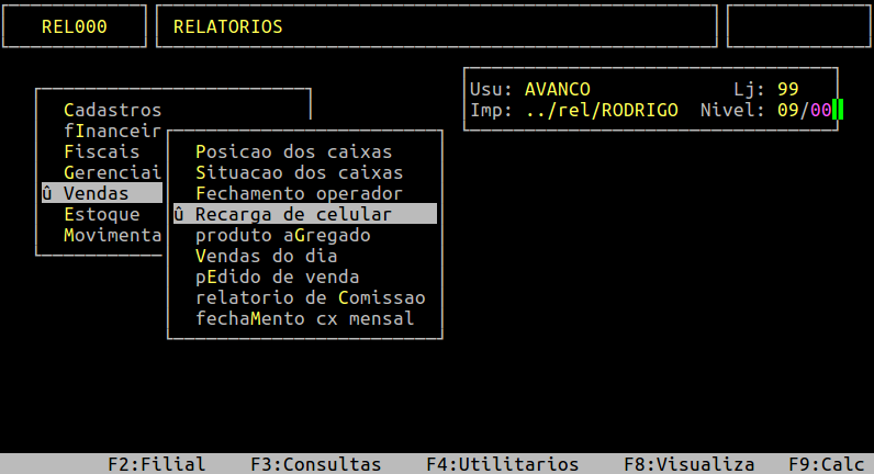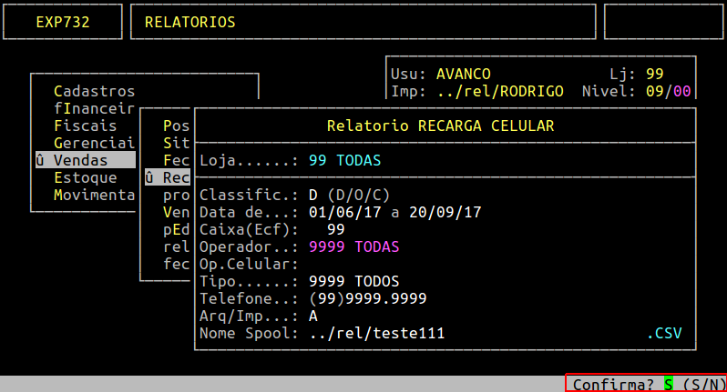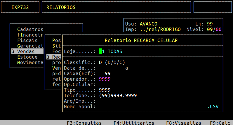 OBSERVAÇÃO: O relatório de Recarga de Celular também é gerado em .csv que fica no /u/rede/csv do servidor da Avanço. |