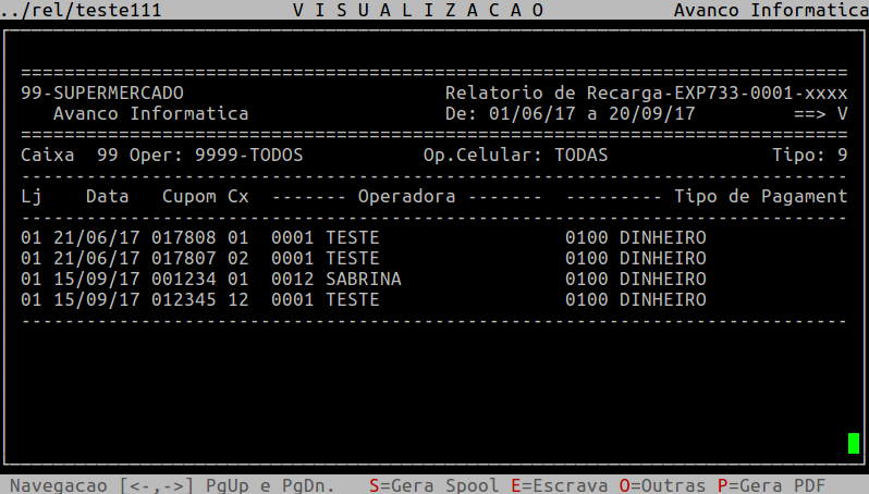 Assim que preencher os campos acima, pressione Enter ou S para gerar o relatório, conforme exemplo abaixo.