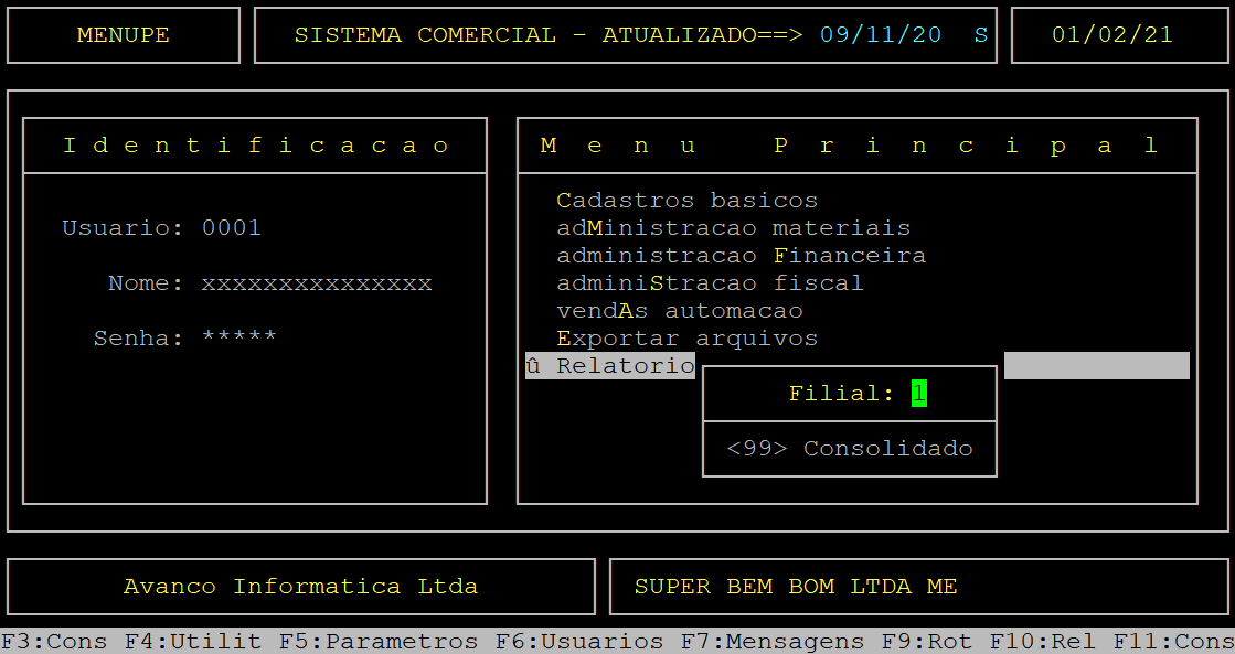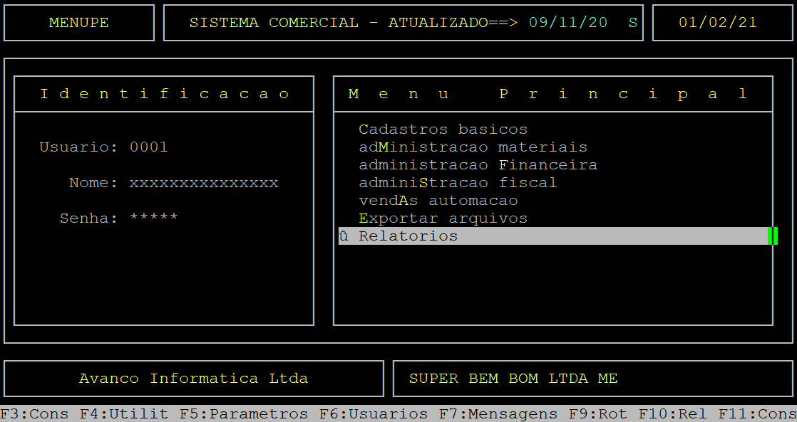 Assim que preencher os campos acima, aperte a tecla Enter ou S para confirmar, conforme o exemplo abaixo (os dados do relatório são meramente ilustrativos).