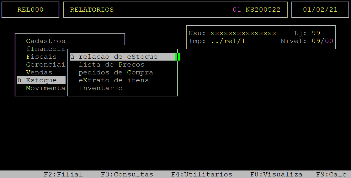 Para emitir o relatório de relação de estoque, acesse a localização citada acima. Utilize as setas do teclado para selecionar os caminhos e, pressione a tecla Enter para confirmá-los.