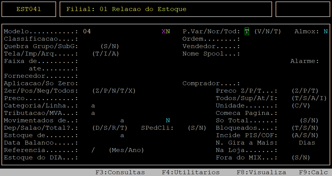Dep/Prod/Total?: | Informe a letra correspondente ao tipo de estoque, sendo: D - Depósito, P - Produção, T - Troca, T - Depósito + Produção, ou X - Depósito + Produção + Troca. |